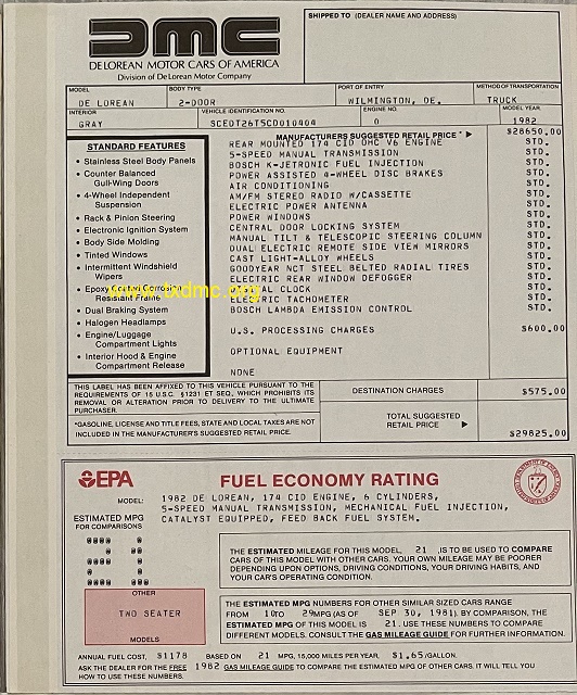 | | | ADDITIONAL INFORMATION / OUTSIDE LINKS: | | | | | | | | | | | | | | This DeLorean (10404) is not known to be associated with any other VINs. | | |